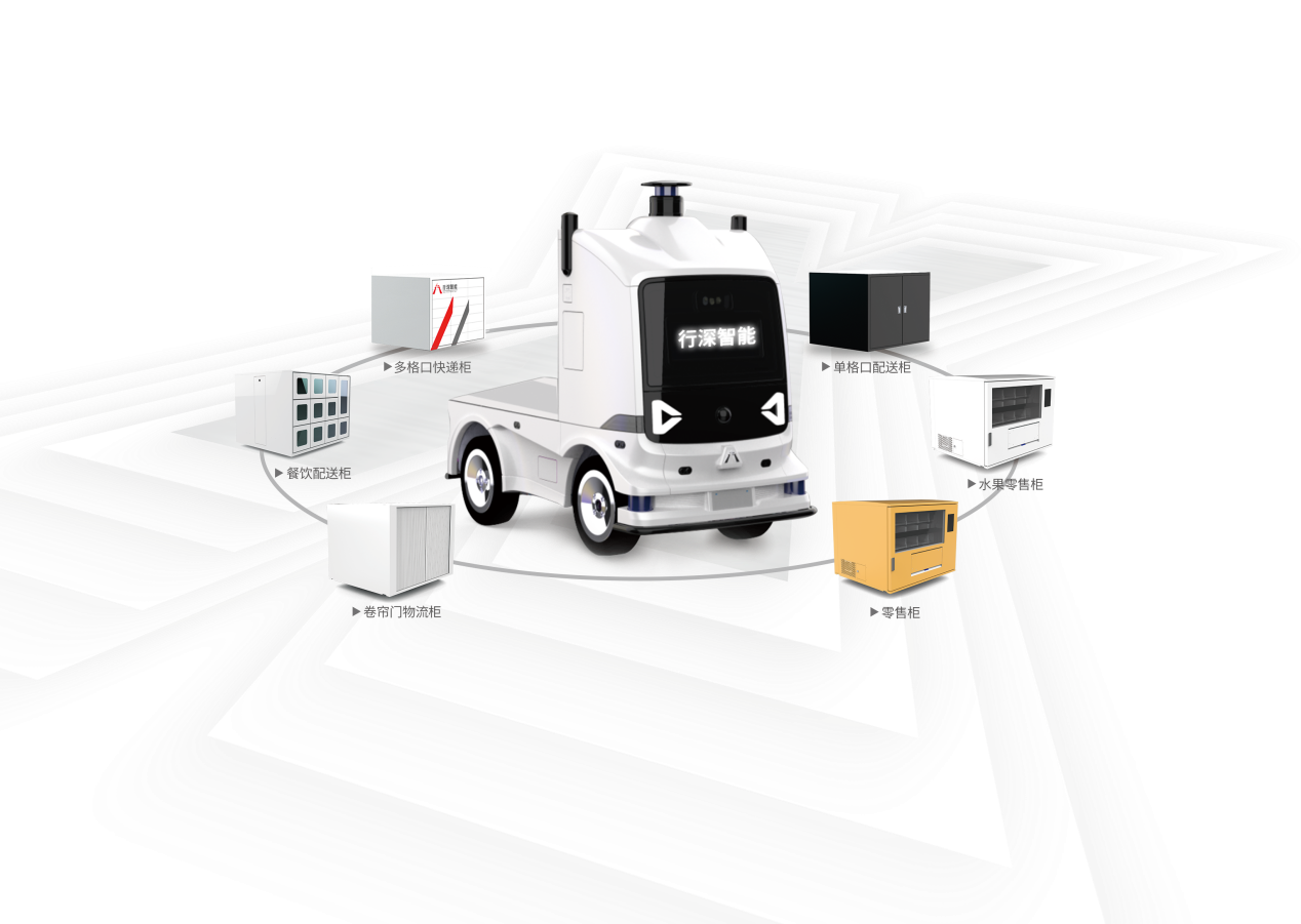 為適應(yīng)多種末端物流應(yīng)用場(chǎng)景,行深智能自主研發(fā)了超影、翻羽、奔霄、絕地和布衣等系列L4級(jí)無(wú)人車產(chǎn)品。其中絕地?zé)o人車作為第五代穩(wěn)定車型,采取了貨柜分離設(shè)計(jì)。可根據(jù)不同客戶業(yè)務(wù)場(chǎng)景提供多種貨柜,零售柜、快遞柜、快餐柜、消殺柜和物流柜等,滿足客戶不同業(yè)務(wù)需求。