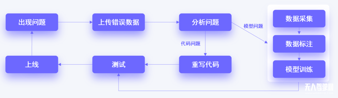 傳統(tǒng)軟件更多是在代碼端解決各類問題,但自動駕駛系統(tǒng)除代碼以外,還有更為關(guān)鍵的AI模型。代碼端的問題可以通過傳統(tǒng)的數(shù)據(jù)閉環(huán)方式予以解決,但模型端的調(diào)整則需要重新訓(xùn)練或優(yōu)化AI算法模型。