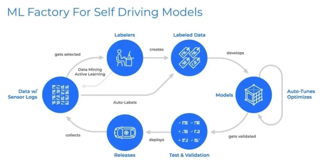 Tesla:核心為Autopilot數(shù)據(jù)引擎框架。獲得數(shù)據(jù)后,先通過單元測試確認(rèn)模型誤差,然后進(jìn)行數(shù)據(jù)清洗與標(biāo)注,最后完成模型訓(xùn)練與部署。