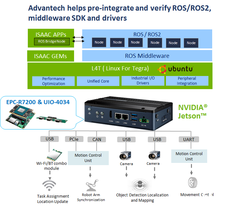 除硬件外,搬運車也用及研華預(yù)先整合的軟件,包含Ubuntu Linux嵌入式系統(tǒng)、ROS/ROS2中介軟件,NVIDIA的ISAAC GEM,驅(qū)動程序及軟件開發(fā)套件(SDK)等,使開發(fā)者可以更專注于人工智能應(yīng)用的開發(fā),省去軟件執(zhí)行環(huán)境的多項初始工作。