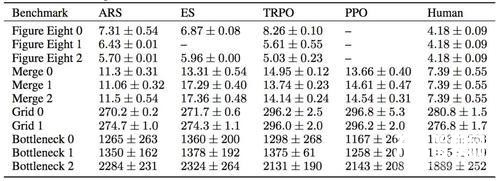 一旦我們制定好了基準(zhǔn),我們就要確保研究人員有一組基準(zhǔn)值來(lái)檢查他們的算法。我們執(zhí)行了一個(gè)小規(guī)模的超參數(shù)掃描,然后將找到最佳超參數(shù)提供以下RL算法運(yùn)使用:增強(qiáng)隨機(jī)搜索,近端策略優(yōu)化,進(jìn)化策略和信任區(qū)域策略優(yōu)化。