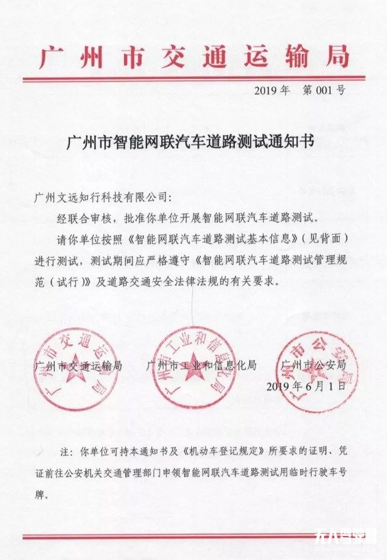 導語:今日,無人駕駛企業(yè)文遠知行WeRide宣布,已于近日收到20張由廣州市政府相關部門頒發(fā)的路測通知書,成為首批獲得廣州市智能網(wǎng)聯(lián)汽車道路測試資格的企業(yè)。