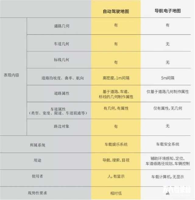 表2:自動駕駛地圖與導航電子地圖的部分差異