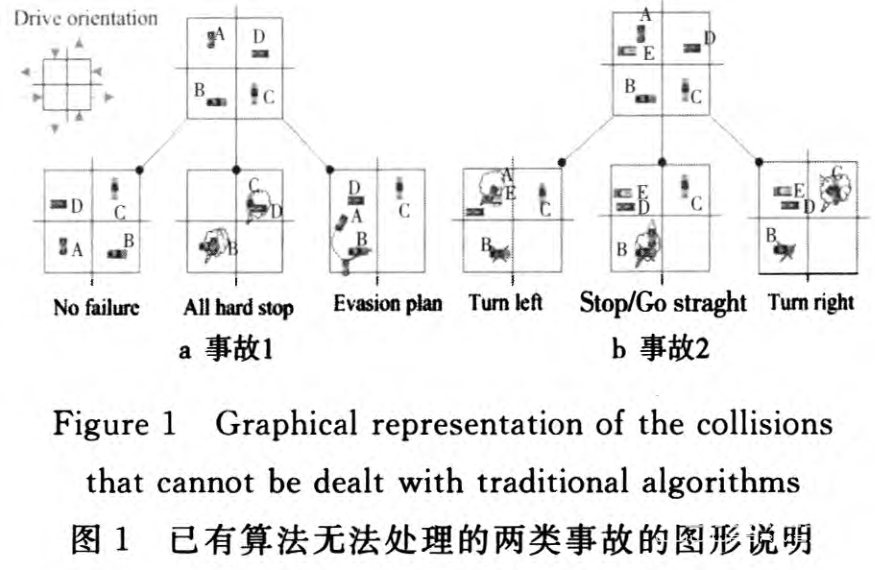 文獻(xiàn)[5~8]等從控制的角度,通過計(jì)算在路口內(nèi)部的車輛的最大可控集合給出防撞機(jī)制,但它只適用于一輛車進(jìn)入事故場景的情形,不能為兩輛以上的車輛同時(shí)給出防撞策略,而且判斷車輛是否屬于最大可控集合是NP困難的[9]。文獻(xiàn)[10]利用無人機(jī)模型給出了多輛車的防撞策略,但是當(dāng)路口車輛較多時(shí),無人機(jī)模型的個(gè)數(shù)呈指數(shù)式增長,因此這個(gè)方法僅適用于路口車輛較少的情況。文獻(xiàn)[11]給出了一個(gè)基于時(shí)間區(qū)間分配策略的算法,它假設(shè)每輛車有無限多個(gè)防撞策略,當(dāng)多輛車需同時(shí)產(chǎn)生防撞策略時(shí),他們通過一個(gè)算法對每個(gè)車輛的防撞策略進(jìn)行組合,以找出最優(yōu)防撞策略,因此這個(gè)算法能處理路口車輛較多的情形。Hafner等人在文獻(xiàn)[12]中給出了一個(gè)算法,這個(gè)算法以剎車和限速兩種方式確保車輛沒有相撞的可能性。以上的算法在處理下面兩類事故(如圖1所示)時(shí)存在不足,如圖1a所示,如果所有車輛沒有出現(xiàn)故障,它們會(huì)順利通過路口。但是,當(dāng)車B突然熄火??吭诼房谥醒霑r(shí),若采用a11一hard—stop策略,慣性可能會(huì)導(dǎo)致車輛發(fā)生碰撞。這種情況下,應(yīng)采用的策略是,車A向右轉(zhuǎn)向,車C和車D繼續(xù)按原計(jì)劃行駛。圖1b表示若假設(shè)車E在A的右前方,則路口空間不足,此時(shí)若車A向右轉(zhuǎn)向會(huì)導(dǎo)致車E和車A的碰撞。為避免兩者相撞,算法應(yīng)為A預(yù)留空間。
