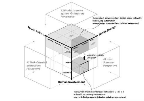 在產(chǎn)品邏輯上,我們必須考慮自動(dòng)駕駛產(chǎn)品服務(wù)系統(tǒng)的三個(gè)基本維度,包括基于上文所述的駕駛員/用戶注意力-活動(dòng)變化下系統(tǒng)中的人的參與程度、體現(xiàn)具體業(yè)務(wù)流程的服務(wù)旅程以及接觸點(diǎn),包括如何使用核心產(chǎn)品(車輛)和其他相關(guān)產(chǎn)品和系統(tǒng)。通過(guò)整合這三個(gè)維度(人的參與、服務(wù)旅程和接觸點(diǎn))去思考將為我們揭示一些新的設(shè)計(jì)機(jī)會(huì)。