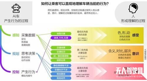 如何把AV那些復(fù)雜且工程的信息簡(jiǎn)化成乘客容易理解且關(guān)心的信息呢?我們的方式是將信息按照用戶認(rèn)知的過(guò)程分級(jí),逐級(jí)將AV世界的信息呈現(xiàn)給用戶。