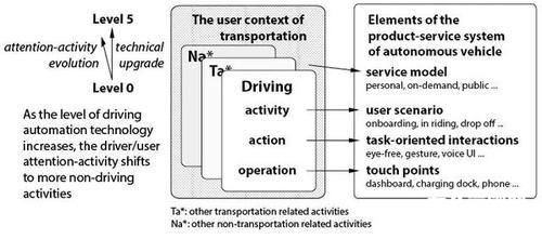 未來(lái)將以基于旅程相關(guān)的產(chǎn)品服務(wù)系統(tǒng)設(shè)計(jì)復(fù)雜的可持續(xù)性的汽車行業(yè)設(shè)計(jì)生態(tài),我們采用產(chǎn)品服務(wù)系統(tǒng)(PSS)設(shè)計(jì)思路,推演出一種基于用戶注意力-活動(dòng)維度伴隨自動(dòng)駕駛技術(shù)升級(jí)而產(chǎn)生的變遷及其對(duì)應(yīng)的設(shè)計(jì)考量因素。