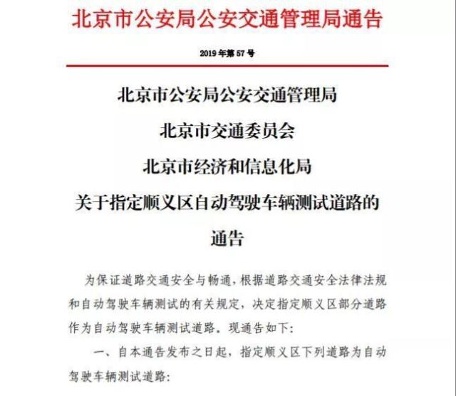 10月11日,北京市公安局公安交通管理局、北京市交通委員會(huì)和北京市經(jīng)濟(jì)和信息化局聯(lián)合發(fā)布《關(guān)于指定順義區(qū)自動(dòng)駕駛車(chē)輛測(cè)試道路的通告》。其中規(guī)定,北京市順義區(qū)新增26條自動(dòng)駕駛測(cè)試道路;持有測(cè)試牌照的自動(dòng)駕駛車(chē)輛每天9時(shí)至17時(shí)可在指定測(cè)試道路上測(cè)試。