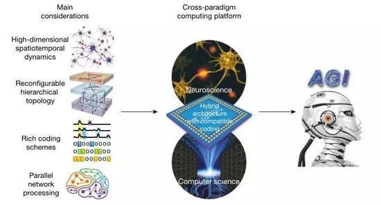 一般認(rèn)為,實現(xiàn)通用人工智能有兩條路,分別為計算機科學(xué)導(dǎo)向和神經(jīng)科學(xué)導(dǎo)向。天機芯就是神經(jīng)科學(xué)導(dǎo)向,它采用了類似生物神經(jīng)元的鏈接和運行方式,更接近人腦的工作方式。并且將這兩種方式統(tǒng)一在了一個運算單元中,融合了計算機科學(xué)和神經(jīng)科學(xué)兩方的優(yōu)勢,是一種推進人工通用智能發(fā)展的異構(gòu)融合芯片架構(gòu)。28nm的天機芯片由156個FCores組成,面積為3.8×3.8毫米,包含大約40000個神經(jīng)元和1000萬個突觸,可以同時支持機器學(xué)習(xí)算法和類腦電路
