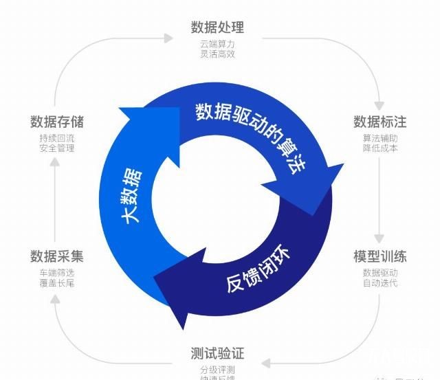 即,通過量產(chǎn)自動駕駛產(chǎn)品獲得海量數(shù)據(jù),持續(xù)研發(fā)數(shù)據(jù)驅動的核心算法,打造閉環(huán)自動化工程體系,發(fā)揮數(shù)據(jù)價值,高效迭代技術,最終實現(xiàn)完全無人駕駛。