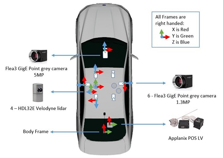 據(jù)福特官網(wǎng)介紹,每個傳感器都經(jīng)過了嚴格的校準。在該數(shù)據(jù)集中使用的坐標框架包括傳感器框架,主體框架,局部框架,GPS框架和全局框架。