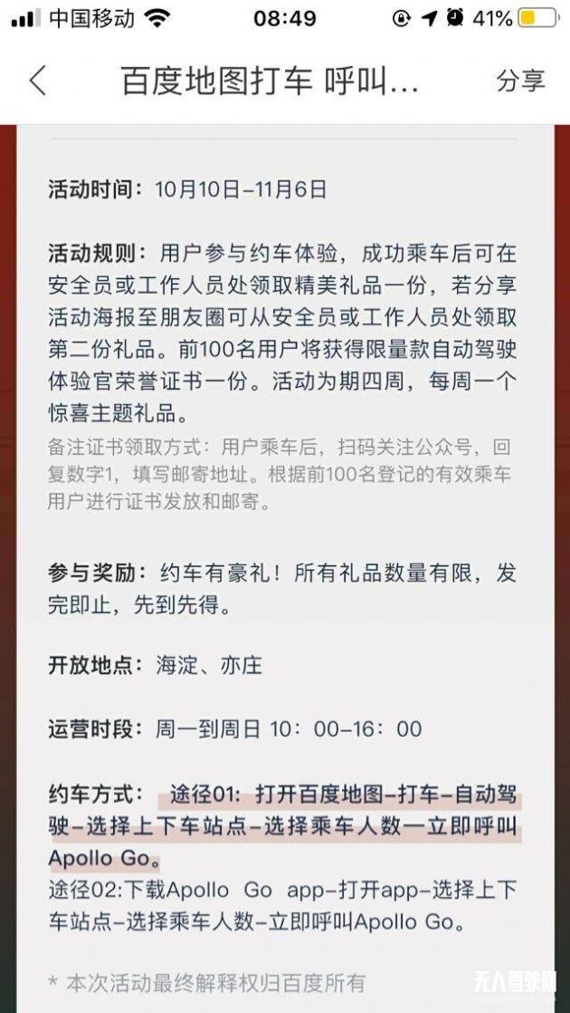 在此前,百度自動駕駛出租車服務已在長沙、滄州開放運營。此次在北京開放服務,百度Apollo Go還推出了“乘車有禮”活動,用戶參與約車體驗,成功乘車后還有禮品贈送,活動時間為10月10日至11月6日。