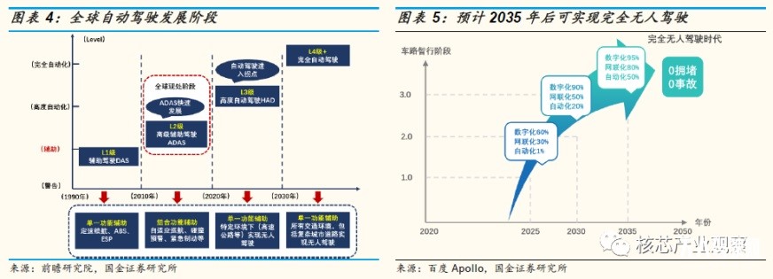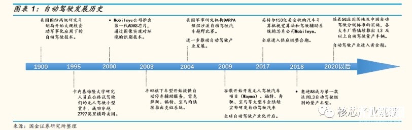 自動(dòng)駕駛最早應(yīng)用于20世紀(jì)90年代的美國(guó)軍事領(lǐng)域,產(chǎn)業(yè)化開(kāi)始于21世紀(jì)谷歌 Moonshot 計(jì)劃中的無(wú)人車(chē)項(xiàng)目。以英特爾153億美金收購(gòu)無(wú)人駕駛視覺(jué)芯片公司 Mobileye 為標(biāo)志事件,全球進(jìn)入供應(yīng)鏈整合期。2020 年開(kāi)始,主流車(chē)廠(chǎng)預(yù)計(jì)將陸續(xù)推出L3及以上自動(dòng)駕駛量產(chǎn)車(chē)輛,自動(dòng)駕駛產(chǎn)業(yè)有望進(jìn)入黃金發(fā)展期。