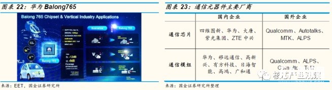 通信元器件:通信芯片、通信模組。通信芯片是處理各種數(shù)據(jù)的中樞,目  前市場(chǎng)主流通信芯片有華為雙模通信芯片 Balong 765;大唐的 PC5 Mode 4 LTE-V2X 自研芯片;高通的 9150 LTE-V2X 芯片組。通訊芯片及外圍器件組成了通信模組,如華為基于 Balong 765 芯片的 LTE-V2X 商用車(chē)規(guī)級(jí)通信模組 ME959;大唐基于自研芯片的 PC5 Mode 4 LTE-V2X 車(chē)規(guī)級(jí)通信模組 DMD31;移遠(yuǎn)聯(lián)合高通發(fā)布的 LTE-V2X 通信模組 AG15。