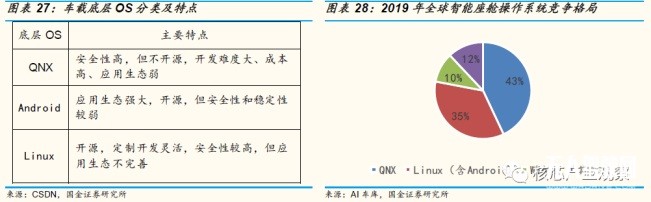 智能座艙操作系統(tǒng):智能座艙操作系統(tǒng)主要為車(chē)載信息娛樂(lè)服務(wù)以及車(chē)內(nèi)人機(jī)交互提供控制平臺(tái),是汽車(chē)實(shí)現(xiàn)座艙智能化與多源信息融合的運(yùn)行環(huán)境,支撐用戶(hù)應(yīng)用平臺(tái)的定制開(kāi)發(fā)。從用戶(hù)端為語(yǔ)音圖像識(shí)別、人機(jī)交互、地圖導(dǎo)航、信息安全、人-車(chē)-路- 云數(shù)據(jù)融合等應(yīng)用提供支撐。隨著汽車(chē)場(chǎng)景逐漸轉(zhuǎn)變?yōu)橹悄芤苿?dòng)終端,智能座艙操作系統(tǒng)需要通過(guò)支持更多個(gè)性化的應(yīng)用服務(wù)及強(qiáng)大的生態(tài),面向客戶(hù)進(jìn)行差異化競(jìng)爭(zhēng)。目前,全球智能座艙操作系統(tǒng)的標(biāo)準(zhǔn)還未統(tǒng)一,在傳統(tǒng)智能座艙操作系統(tǒng)中,QNX 占據(jù)了 40%以上的市場(chǎng)份額,但隨著智能座艙信息娛樂(lè)應(yīng)用的逐漸豐富,擁有強(qiáng)大生態(tài)基礎(chǔ)的開(kāi)源操作系統(tǒng) Linux(含 Android)占據(jù)第二大市場(chǎng)空間。