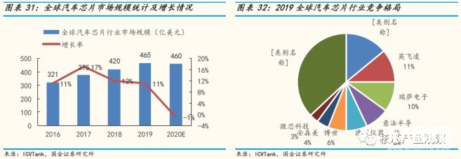 汽車(chē)芯片市場(chǎng)規(guī)模快速增長(zhǎng),壟斷格局逐步打破。據(jù) ICVTank 數(shù)據(jù)顯示,2019 年全球汽車(chē)芯片市場(chǎng)規(guī)模達(dá) 465 億美元,同比增長(zhǎng) 11%,受全球新冠疫情的影響,在汽車(chē)銷(xiāo)量下滑沖擊下,2020 年全球汽車(chē)芯片市場(chǎng)規(guī)模將有小幅下滑,預(yù)計(jì)規(guī)模為 460 億美元。2019 年,恩智浦占全球汽車(chē)芯片市場(chǎng) 14%,英飛凌次之,占比 11%,目前全球汽車(chē)芯片的市場(chǎng)集中度較高,行業(yè) CR4 為 43%,行業(yè) CR8 達(dá) 63%。隨著汽車(chē)行業(yè)加速進(jìn)入智能化時(shí)代,這一格局將逐步打破,包括以高通、英偉達(dá)為代表的傳統(tǒng)汽車(chē)半導(dǎo)體廠(chǎng)商、以谷歌、亞馬遜、蘋(píng)果等為代表的互聯(lián)網(wǎng)科技公司、以?shī)W迪、寶馬、特斯拉為代表的整車(chē)企業(yè)大舉進(jìn)軍自動(dòng)駕駛芯片領(lǐng)域,行業(yè)未來(lái)將會(huì)形成多頭競(jìng)爭(zhēng)的格局。