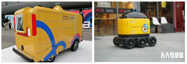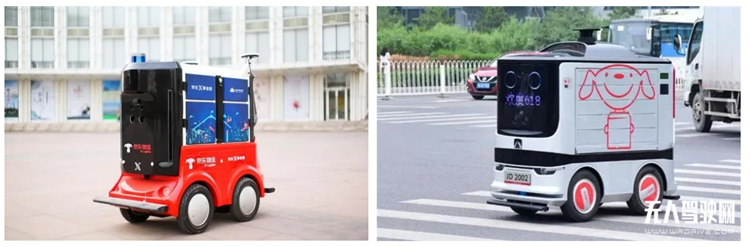 京東:2017年"6-18",京東首批試點(diǎn)運(yùn)營(yíng)的無人配送車在中國(guó)人民大學(xué)進(jìn)行快遞投遞。2018年"6-18",在京東的北京上地配送站,20余臺(tái)配送機(jī)器人整齊列陣。隨著調(diào)度平臺(tái)命令發(fā)出,首批載有”6-18”貨物訂單的配送機(jī)器人依次出發(fā),自動(dòng)駛向訂單配送的目的地。