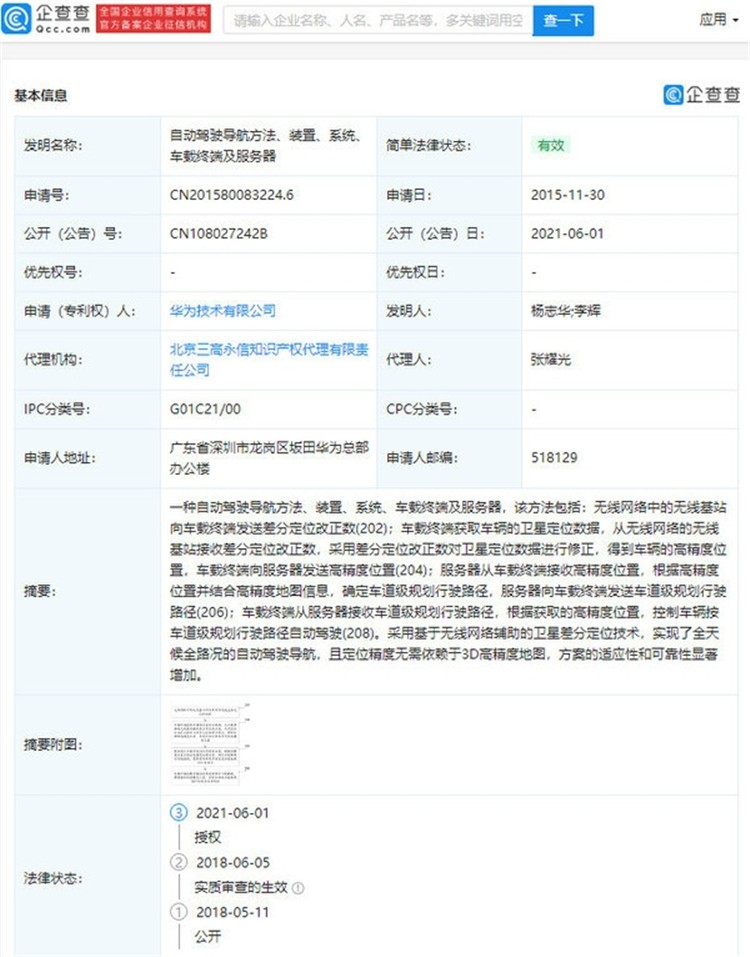 企查查內(nèi)容顯示,早在2015年11月30日,華為就已申請“自動駕駛導(dǎo)航方法、裝置、系統(tǒng)、車載終端及服務(wù)器”專利,該專利于2018年5月11日公開,于2021年6月1日獲得授權(quán)。