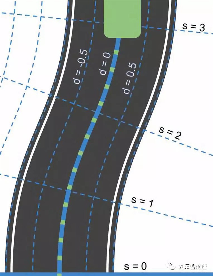 在Frenet坐標(biāo)系中,可以平面上的點(diǎn)的位置可以由縱軸和橫軸定位,分別記為S和D 。其背后的數(shù)學(xué)原理非常復(fù)雜,在此我們不進(jìn)行累述。你可以認(rèn)為穿過道路中心的曲線決定了S軸,并指出了車輛在路上走了多遠(yuǎn);D軸則映射為車輛的側(cè)向位移。下圖顯示了彎曲道路在Frenet坐標(biāo)系上的樣子: