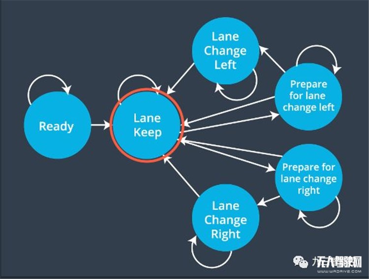 最常見的狀態(tài)是保持車道,但每當(dāng)我們想要改變車道,汽車將首先過渡到準(zhǔn)備換車道的左/右狀態(tài),并在確保轉(zhuǎn)換車道是安全的。在換車道前進(jìn)入的中間狀態(tài),類似于車輛在換車道前打開左/右信號。