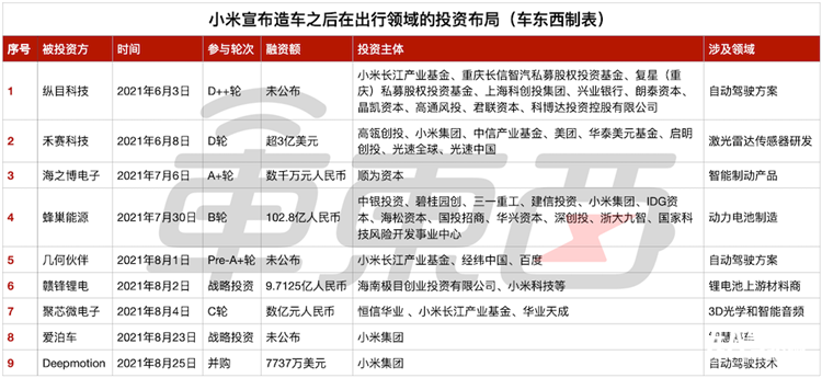 不過跟其他的資本機(jī)構(gòu)不同,小米在投資人的身份之外,也選擇了下場(chǎng)造車,從觀眾變成了參賽選手。所以在宣布造車之后,小米的投資更加集中。