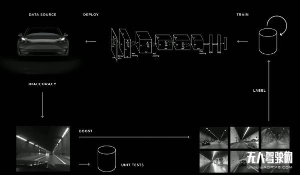 再利用車輛影子模式,但凡遇到實(shí)際駕駛情況和自動(dòng)駕駛AI決策不一致的情況,這部分行車數(shù)據(jù)會(huì)自動(dòng)上傳至特斯拉后臺(tái)數(shù)據(jù)引擎中,在被自動(dòng)標(biāo)注后,重新納入已有的數(shù)據(jù)訓(xùn)練集中,繼續(xù)訓(xùn)練原本的神經(jīng)網(wǎng)絡(luò),直到新的數(shù)據(jù)被掌握。