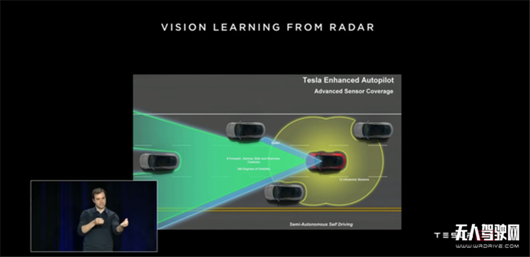值得一提的是,在他講解時(shí)的背景幻燈片右下角上,清晰地注明了帶有毫米波雷達(dá)的自動(dòng)駕駛算法是“Semi-Automonous Self Driving”,翻譯過(guò)來(lái)是,半自動(dòng)駕駛,明顯彼時(shí)的特斯拉Autopilot只是個(gè)半成品。