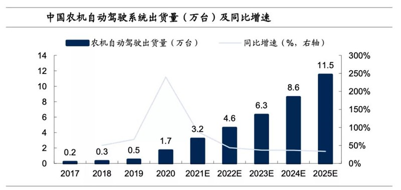 近年來我國農(nóng)作物綜合機械化率顯著提高,2020年主要糧食作物耕種收綜合機械化率均超過80%,其中農(nóng)機無人駕駛系統(tǒng)市場有顯著的增長。行業(yè)報道,2020 年全國北斗導航農(nóng)機自動駕駛系統(tǒng)銷量約1.7萬臺,根據(jù)農(nóng)機相關網(wǎng)站公布的2020年銷量前十產(chǎn)品均價5.4 萬元/臺估算,整體市場規(guī)模已達9.18 億元;預計2025年出貨量可達11.5 萬套,對應市場規(guī)模超60億,20-25年復合增速約47%。