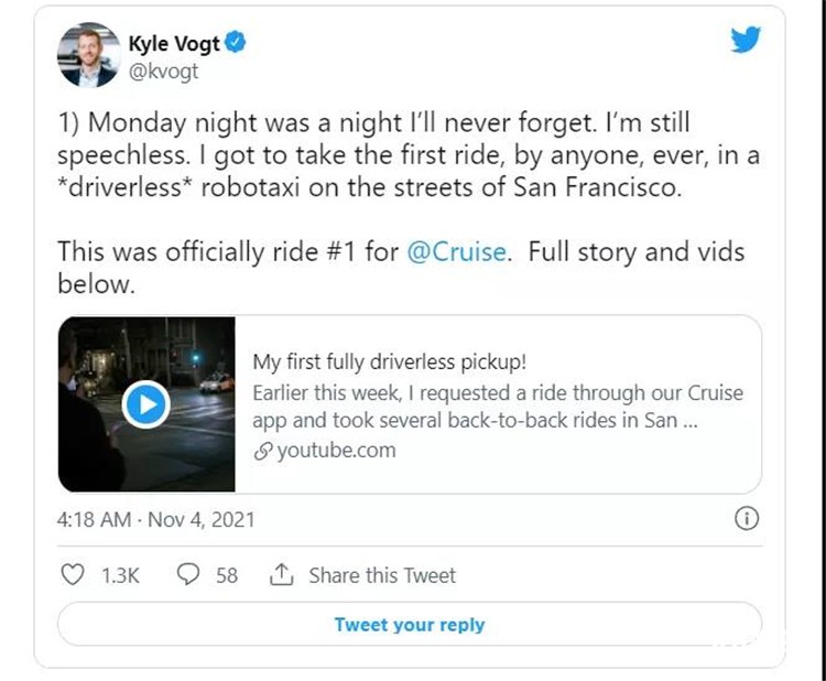 據(jù)TechCrunch報道,當(dāng)?shù)貢r間本周一晚上,通用汽車旗下自動駕駛子公司Cruise首次在車內(nèi)沒有人的情況下啟動了一輛AV(自動駕駛汽車)。Cruise公司的聯(lián)合創(chuàng)始人、首席技術(shù)官兼總裁Kyle Vogt是第一個乘坐的人,他在Twitter上對此進(jìn)行大肆宣傳。