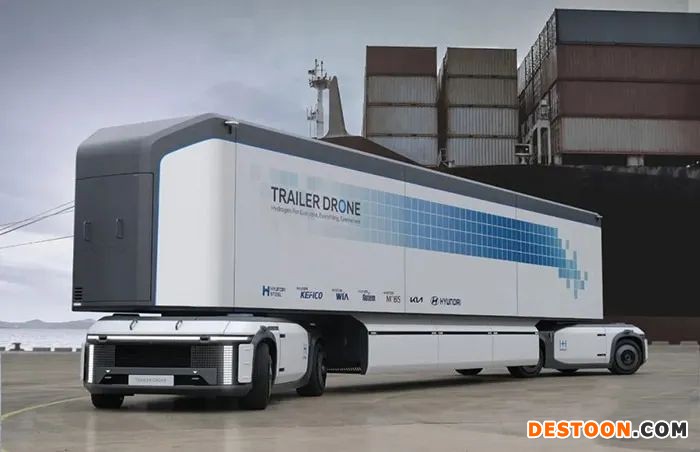 2021進(jìn)博會上,現(xiàn)代汽車帶來了Trailer Drone概念卡車。作為一種可實(shí)現(xiàn)完全自動駕駛的集裝箱運(yùn)輸系統(tǒng),其搭載氫燃料電池系統(tǒng)作為動力源,同時(shí)搭載兩臺智能無人運(yùn)輸平臺e-Bogie。