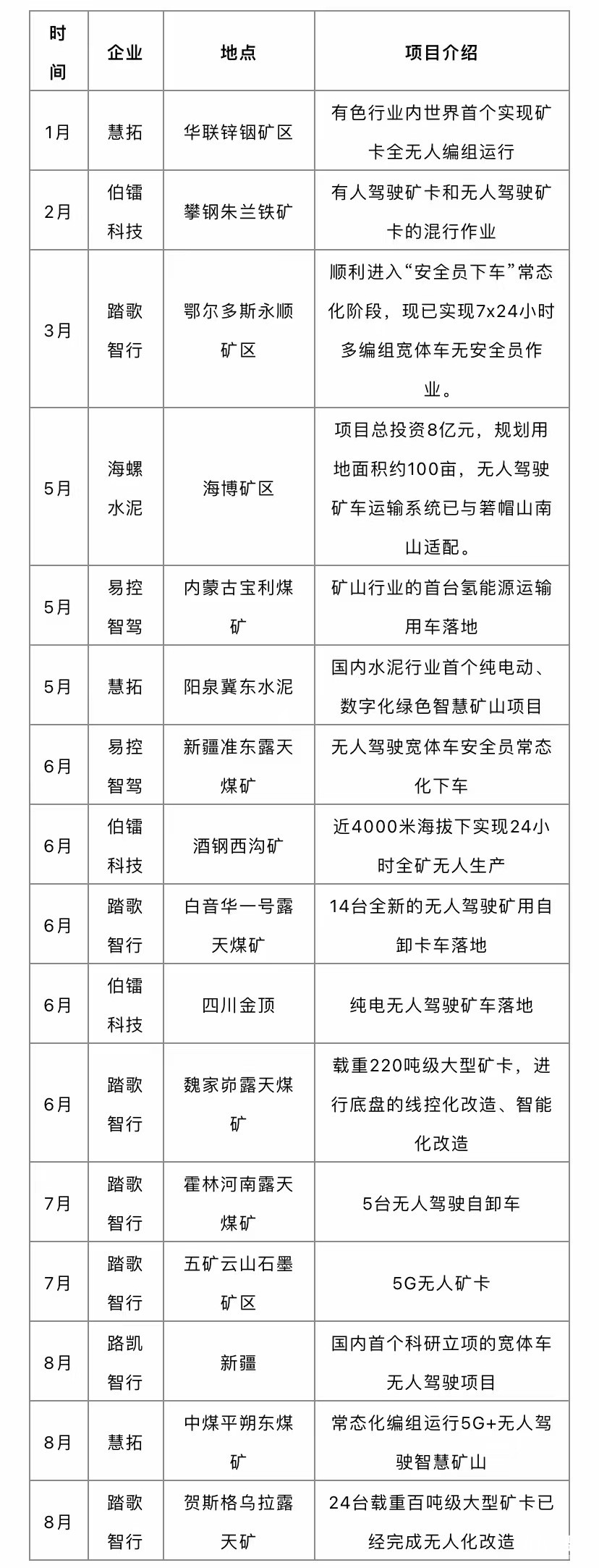 基于技術(shù)和產(chǎn)品的快速發(fā)展,礦區(qū)無人駕駛領(lǐng)域各企業(yè)今年以來實(shí)現(xiàn)了多個(gè)全球、全國(guó)“首次”及行業(yè)標(biāo)桿項(xiàng)目,大力推進(jìn)了國(guó)內(nèi)礦區(qū)無人駕駛領(lǐng)域發(fā)展,具體包括: