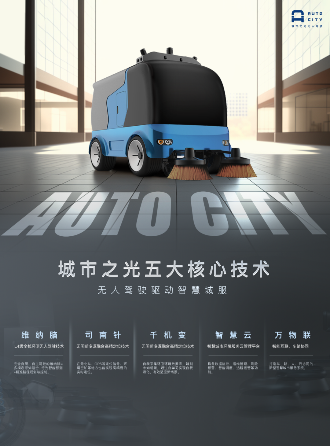 導(dǎo)語:城市之光作為L4級別無人駕駛新銳科技公司,致力于以無人駕駛技術(shù)驅(qū)動(dòng)智慧城服,此次也積極響應(yīng)市政府的號召在展會上精彩亮相,展示公司研發(fā)落地的無人駕駛清掃車“風(fēng)神V2”系列。