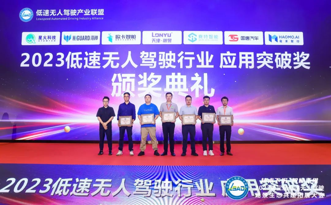 現(xiàn)場舉行了2023低速無人駕駛行業(yè)應(yīng)用突破獎頒獎儀式,星火科技、海神機(jī)器人、歐卡智舶、天津朗譽(yù)、賽特智能、國唐汽車、毫末智行7家企業(yè)獲得殊榮。