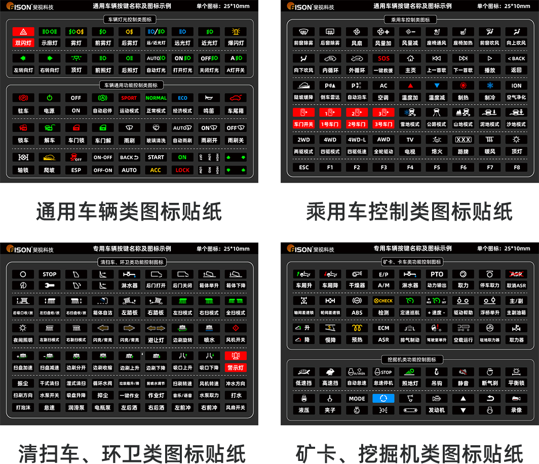 斐視科技提供近五百項功能按鍵名稱貼紙,涵蓋通用車輛、礦卡、挖掘機類、清掃環(huán)衛(wèi)車類、乘用車類、礦機類領域,能夠滿足95%以上設備的功能按鍵定義需求。后續(xù)該貼紙品類還將不斷更新優(yōu)化,以滿足更多用戶的自定義需求。