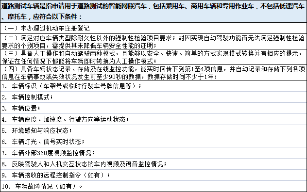 同時(shí),要求車輛必須具備人工操作和自動駕駛兩種模式;具備車輛狀態(tài)記錄、存儲及在線監(jiān)控功能。