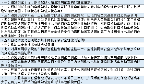 1、道路測試主體應(yīng)提供道路測試安全性自我聲明及自動駕駛功能等級聲明、設(shè)計(jì)運(yùn)行條件、網(wǎng)絡(luò)安全措施等12項(xiàng)材料由相關(guān)主管部門進(jìn)行確認(rèn)。