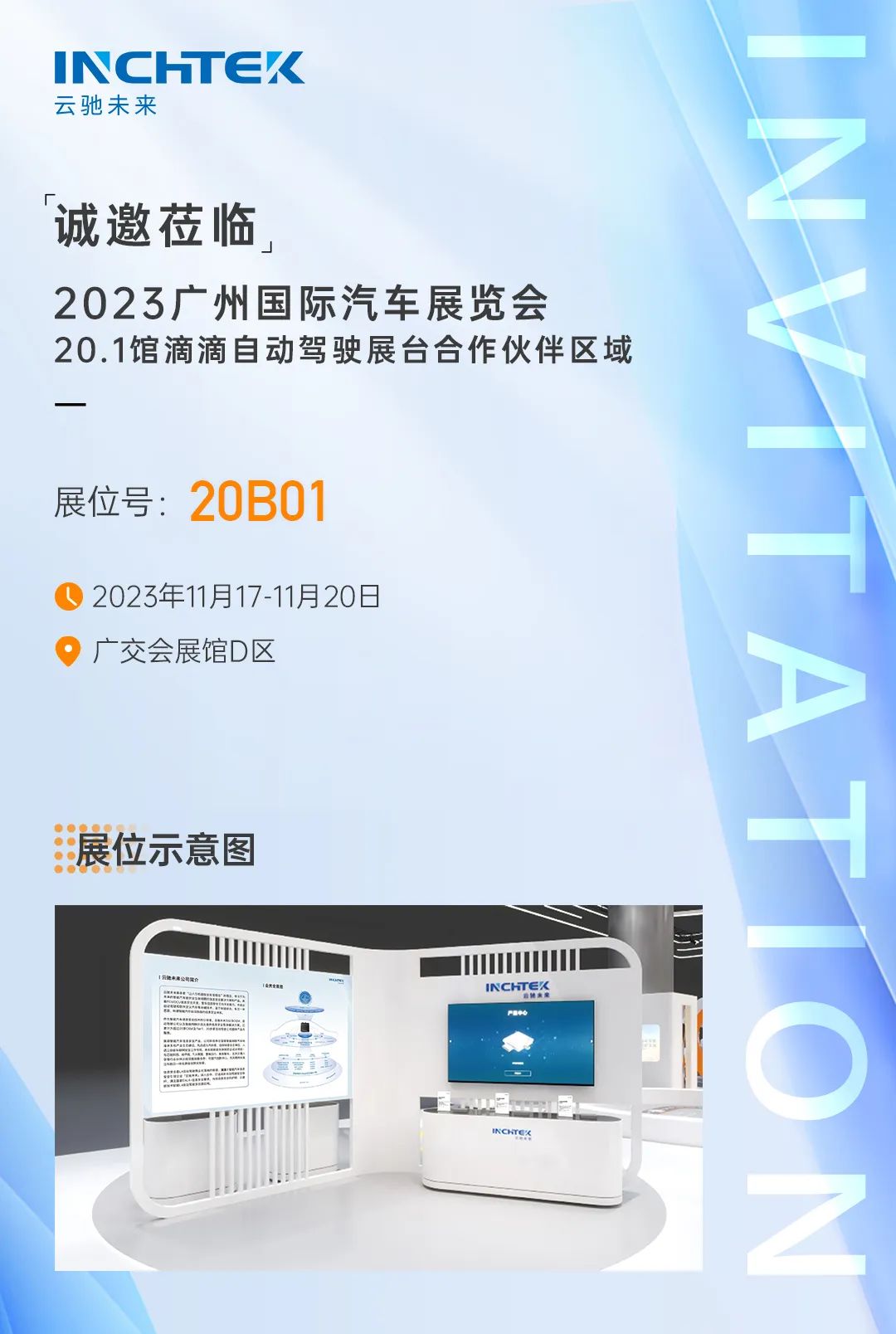 本次廣州國際汽車展,云馳未來也將作為滴滴自動駕駛的合作伙伴,共同參展。歡迎業(yè)界朋友,于11月17-20日,前往廣交會展館D區(qū)20B01參觀。期待您的蒞臨!