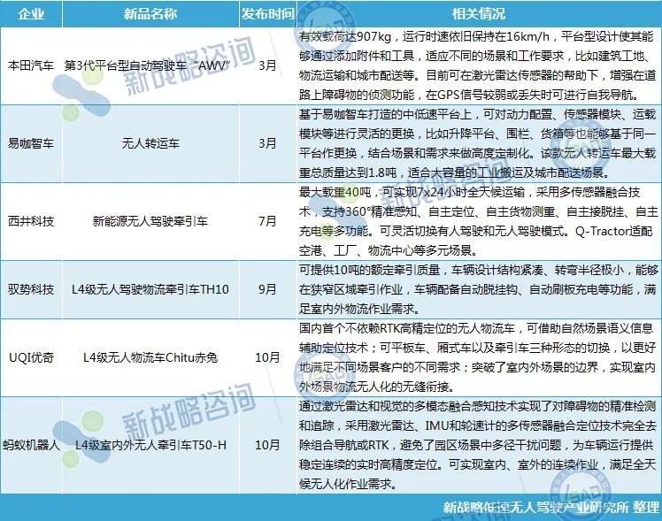上表所列新品以無人牽引車和無人物流車為主,在產(chǎn)品形態(tài)和核心技術(shù)上有了如下變化: