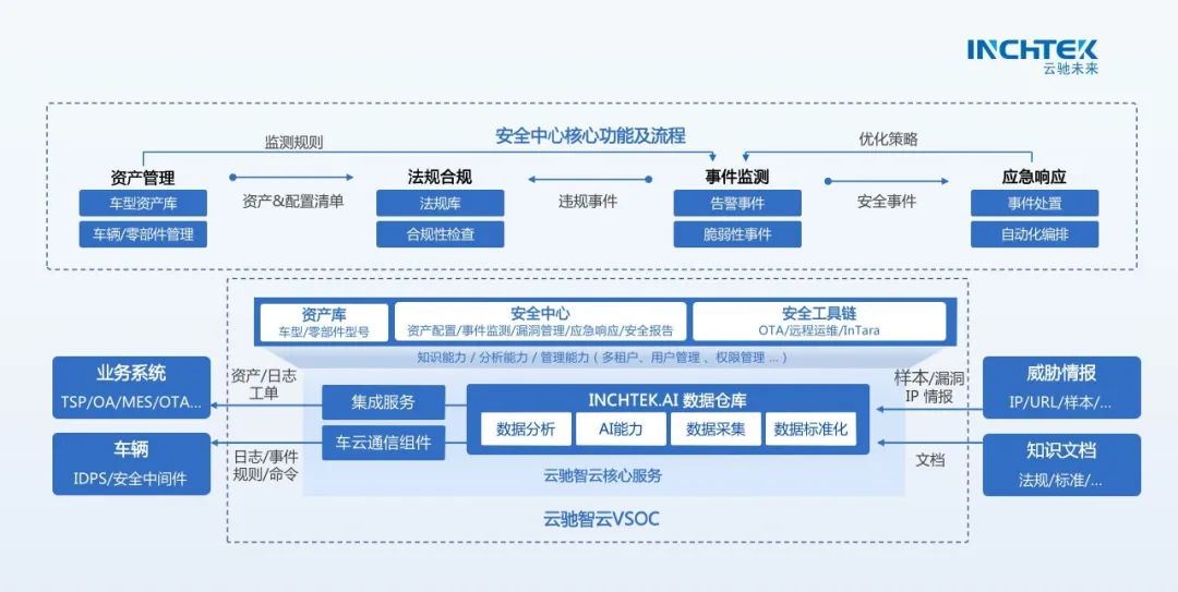 云馳智云安全運(yùn)營(yíng)中心VSOC通過為智能網(wǎng)聯(lián)汽車提供采集、分析、預(yù)警、處置的運(yùn)營(yíng)框架,幫助客戶持續(xù)應(yīng)對(duì)網(wǎng)絡(luò)攻擊、威脅事件及漏洞。產(chǎn)品以合規(guī)為基礎(chǔ)能力,提供開箱即用的監(jiān)測(cè)規(guī)則及報(bào)表報(bào)告,幫助客戶快速滿足法規(guī)要求,支撐國(guó)內(nèi)外審核認(rèn)證工作開展。在此基礎(chǔ)上,通過與InchTek安全工具鏈無縫銜接,賦能企業(yè)的威脅分析、需求管理、漏洞管理、應(yīng)急處置,幫助車企守住安全底線,持續(xù)挖掘運(yùn)營(yíng)價(jià)值。