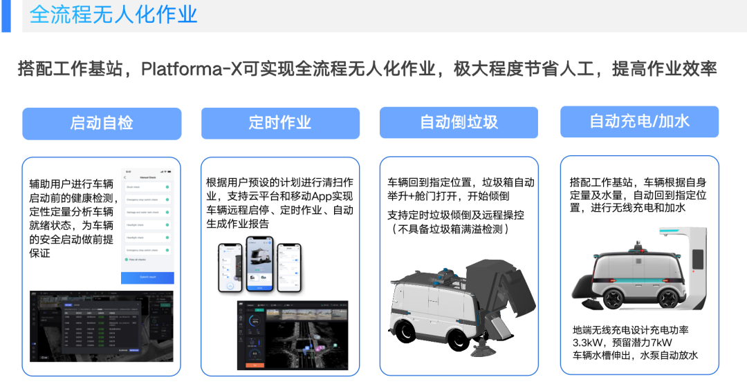 實(shí)現(xiàn)“一車多用+全流程無人化”兩大創(chuàng)新的同時,Platforma-X的清掃能力同樣具備競爭力。車輛配備700L超大垃圾箱和240L清水箱,是同類自動駕駛清掃產(chǎn)品的2~3倍,可實(shí)現(xiàn)2~4倍于競品的作業(yè)效率;以更為先進(jìn)的吸掃模式替代行業(yè)普遍采用的傳統(tǒng)滾掃模式,清掃潔凈率大于95%。得益于小巧的機(jī)身設(shè)計,Platforma-X不光適用于園區(qū)、廠區(qū)、停車場、住宅小區(qū)等中小型場景,在城市人行道、非機(jī)動車道、主干道和廣場、交通樞紐等中大型場景亦有不俗的表現(xiàn)。