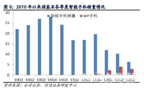 然而好景不長(zhǎng),2012年蘋果降維打擊諾基亞塞班生態(tài),后者可以說(shuō)是突然死亡,手機(jī)出貨量直接崩潰(那一年多從高點(diǎn)下來(lái)跌去了50%)。四維圖新的“新增長(zhǎng)點(diǎn)”迅速衰退,說(shuō)沒(méi)就沒(méi)了。