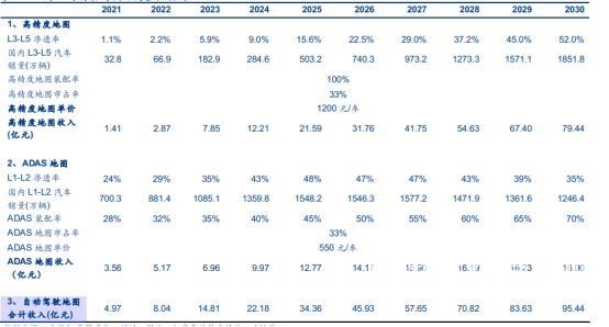 (1)高精度地圖是高等級(jí)自動(dòng)駕駛L3及以上的必選項(xiàng),協(xié)助輔助感知,確定車輛位置和路徑規(guī)劃是極為重要的能力。自動(dòng)駕駛的高精度地圖目前滲透率極低,未來(lái)隨著自動(dòng)駕駛的普及,初裝地圖的市場(chǎng)規(guī)模將獲得極大提升。