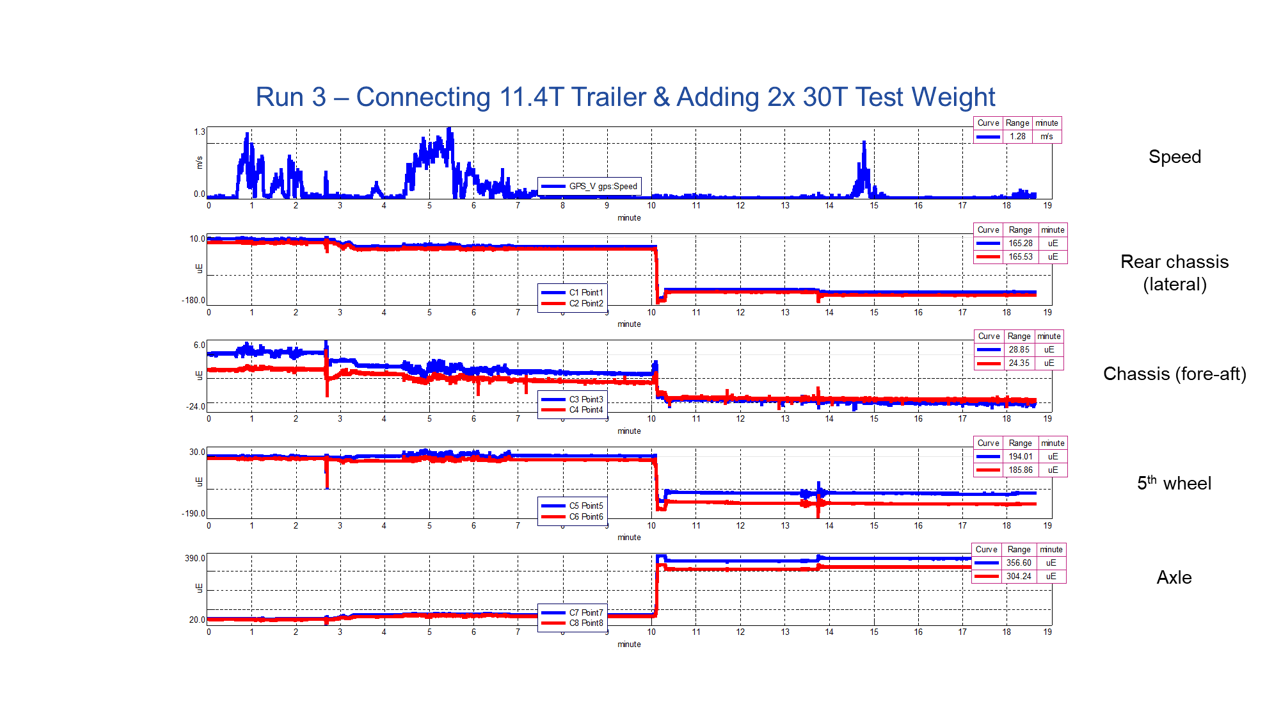 通過(guò)港口實(shí)際連接及脫離掛車(chē),加速減速,轉(zhuǎn)彎,緊急制動(dòng)工況的路譜采集,應(yīng)力應(yīng)變采集完成實(shí)測(cè)。
