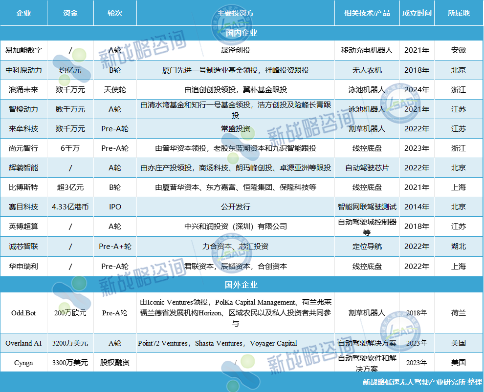 獲得融資的整車 / 自動駕駛解決方案企業(yè),多為庭院服務(wù)機(jī)器人企業(yè)。其中,來自泳池機(jī)器人賽道的浪涌未來和智橙動力,兩筆融資皆源于產(chǎn)業(yè)資本,前者追創(chuàng)創(chuàng)投是掃地機(jī)器人龍頭追覓科技旗下基金,后者基金主要來自科沃斯。