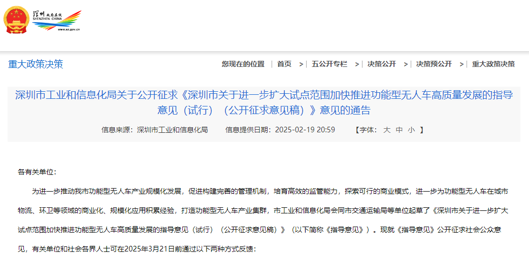 2月19日消息,為進(jìn)一步推動(dòng)深圳市功能型無(wú)人車產(chǎn)業(yè)規(guī)?;l(fā)展,《深圳市關(guān)于進(jìn)一步擴(kuò)大試點(diǎn)范圍加快推進(jìn)功能型無(wú)人車高質(zhì)量發(fā)展的指導(dǎo)意見(jiàn)(試行)(公開(kāi)征求意見(jiàn)稿)》公開(kāi)征求意見(jiàn)。其中提到,統(tǒng)籌推進(jìn),試點(diǎn)先行。發(fā)揮市級(jí)層面統(tǒng)籌協(xié)調(diào)作用,整體推進(jìn)功能型無(wú)人車運(yùn)營(yíng)試點(diǎn)管理工作。