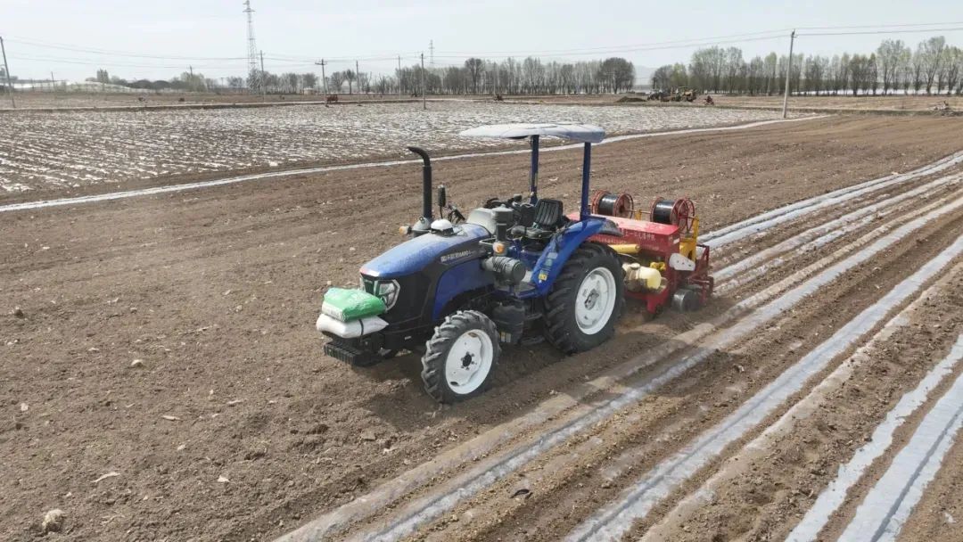 在技術(shù)人員設(shè)定參數(shù)后,搭載北斗導(dǎo)航系統(tǒng)的播種機(jī)自動(dòng)規(guī)劃路線,靈活地轉(zhuǎn)彎、掉頭,所到之處,土地被整齊地翻耕,地膜被平整鋪展。機(jī)身配備的智能傳感器實(shí)時(shí)監(jiān)測(cè)土壤濕度、種子間距等關(guān)鍵數(shù)據(jù)。