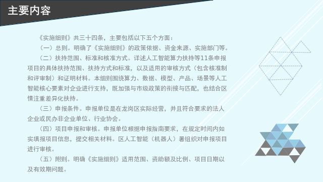 第二十五條 深圳市龍崗區(qū)人工智能(機器人)署根據(jù)本實施細則制定年度扶持計劃項目申請指南(通知),在龍崗政府在線等網(wǎng)站發(fā)布,明確受理時間、申報材料要求等內(nèi)容。