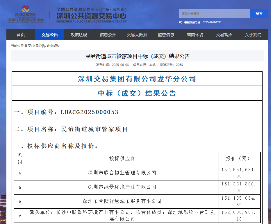 6月4日消息,盈峰環(huán)境全資子公司長沙中聯(lián)重科環(huán)境產(chǎn)業(yè)有限公司與深圳市地鐵集團(tuán)全資子公司深圳地鐵物業(yè)管理發(fā)展有限公司組成聯(lián)合體,成功中標(biāo)深圳市龍華區(qū)民治街道城市管家項(xiàng)目,成交金額1.52億元(年),三年期服務(wù)總額4.56億元。