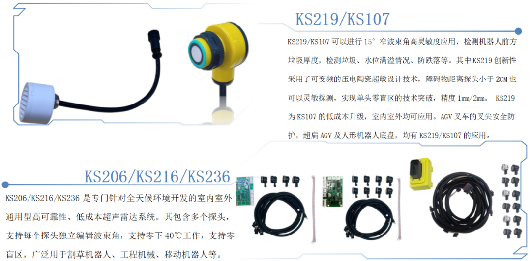 對于礦山車、物流車、港口車輛,可以采用KS236的10~12探頭,波束角編輯為水平100°豎直50°或更大。由于每個探頭均可獨立編輯波束角,對于機器人的不同部位的探測FOV要求適應性好。KS236整機防水,對于一些越野、建筑、牧場、礦山、暴雨等泥濘揚塵場合均可可靠工作。