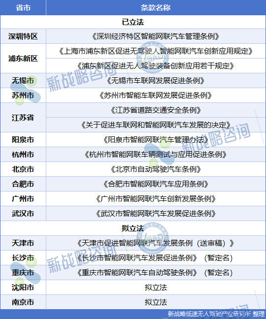 相比德國(guó)、日本、新加坡等已完成國(guó)家層面自動(dòng)駕駛制修法的國(guó)家,我國(guó)在自動(dòng)駕駛領(lǐng)域的立法相對(duì)謹(jǐn)慎,更多的是鼓勵(lì)地方性立法先試先行,為自動(dòng)駕駛立法積累更多實(shí)踐經(jīng)驗(yàn);目前我國(guó)已有深圳、上海、無(wú)錫、蘇州、陽(yáng)泉、杭州、江蘇等多個(gè)省市出臺(tái)實(shí)施自動(dòng)駕駛地方法規(guī)。
